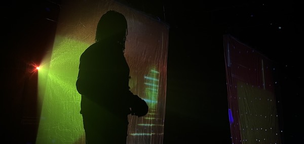 Différents travaux hebdomadaires rythment la recherche de l’artiste. Son projet Generative Dreams, un journal audiovisuel, est le miroir digital de l’expression analogique de ses états de conscience depuis juin 2020. Cette série lui permet d’approfondir ses connaissances des outils liés à sa pratique – Touch Designer et Ableton – tout en lui offrant l’espace d’improviser. À Genève pour arpenter l’inconnu, Noel entreprend des balades routinières entre L’Abri – Carouge et celui de la Madeleine. Les sons qu’il enregistre et les visuels qu’il capture deviennent les repères de ses déambulations. Cette contemplation active, devenue un rituel, enrichit sa recherche immersive. Durant ses trois mois de résidence, l’artiste travaille à dissoudre le son dans la matérialité de la lumière, sculptant l’espace pour faciliter l’acte de s’immerger.