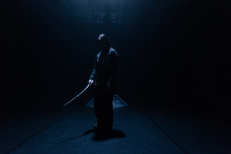 L’interprète est accompagnée d’un ensemble d’objets métalliques portables, à la fois charges et extensions du corps. Ceux–ci génèrent un autel sonore et vocal qui dévoile peu à peu un geste surexposé de conquête de liberté et de résilience dans le chaos.