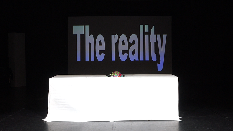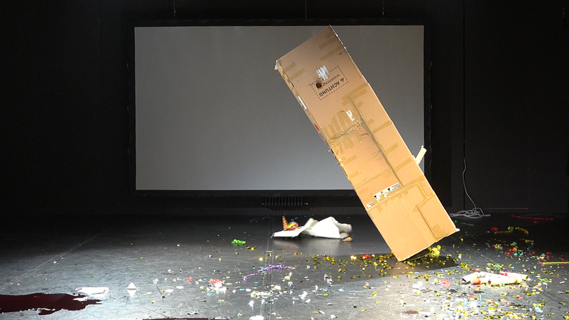 La vidéo, comme porteuse de narrations fictives et réelles, vient s’entremêler sur scène avec les éléments de la performance, la chorégraphie, les objets, la lumière, le son et le texte. Le spectacle est fragmenté, anachronique et fait intervenir des voix et des discours multiples autant comiques et cartoonesques que politiques et dramatiques.